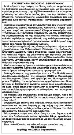 Ευχαριστήριο Φρατζέσκας - Παναγιώτας Βεροπούλου Τετάρτη 12 Φεβρουαρίου 2020 - 11:46 Συντάκτης: Κατερίνα Βιδάλη Κείμενο Βλέπε εικόνα Αριθμός Φύλλου 5310 Κατηγορία Ευχαριστήριο