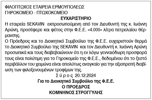 Ευχαριστήριο για δωρεές από τη Φιλόπτωχο Εταιρεία Ερμουπόλεως, Γηροκομείο - Πτωχοκομείο Δευτέρα 23 Δεκεμβρίου 2024 - 15:53 Συντάκτης: Ρένα Ρούσσου Κείμενο Βλέπε εικόνα. Αριθμός Φύλλου 6516 Κατηγορία Δωρεές