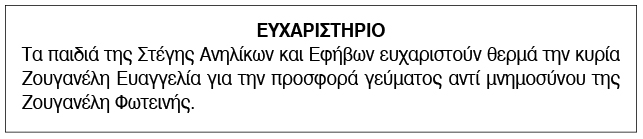 Ευχαριστήριο για δωρεές από τη Στέγη Ανηλίκων και Εφήβων Σύρου Δευτέρα 31 Μαρτίου - 14:32 Συντάκτης: Ρένα Ρούσσου Κείμενο Βλέπε εικόνα. Αριθμός Φύλλου 6578 Κατηγορία Δωρεές