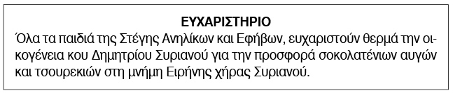 Ευχαριστήριο για δωρεές από τη Στέγη Ανηλίκων και Εφήβων Σύρου Τρίτη 22 Απριλίου - 14:03 Συντάκτης: Ρένα Ρούσσου Κείμενο Βλέπε εικόνα. Αριθμός Φύλλου 6592 Κατηγορία Δωρεές