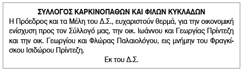 Ευχαριστήριο για δωρεές από το Σύλλογο Καρκινοπαθών και Φίλων Κυκλάδων Παρασκευή 11 Νοεμβρίου 2022 - 14:06 Συντάκτης: Ρένα Ρούσσου Κείμενο Βλέπε εικόνα. Αριθμός Φύλλου 6000 Κατηγορία Ευχαριστήριο