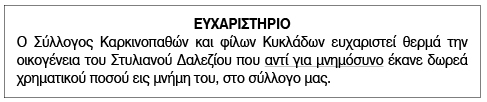 Ευχαριστήριο για δωρεές από το Σύλλογο Καρκινοπαθών και Φίλων Κυκλάδων Τετάρτη 11 Δεκεμβρίου 2024 - 14:57 Συντάκτης: Ρένα Ρούσσου Κείμενο Βλέπε εικόνα. Αριθμός Φύλλου 6508 Κατηγορία Δωρεές