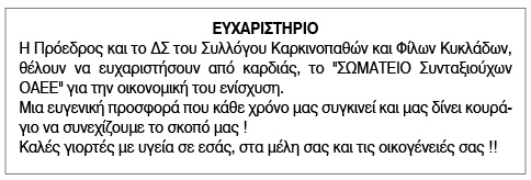 Ευχαριστήριο για δωρεές από το Σύλλογο Καρκινοπαθών και Φίλων Κυκλάδων Τρίτη 17 Δεκεμβρίου 2024 - 15:03 Συντάκτης: Ρένα Ρούσσου Κείμενο Βλέπε εικόνα. Αριθμός Φύλλου 6512 Κατηγορία Δωρεές