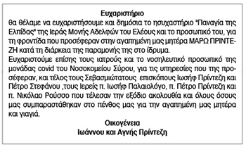 Ευχαριστήριο για Μάρω Πρίντεζη Τετάρτη 24 Αυγούστου 2022 - 13:21 Συντάκτης: Ρένα Ρούσσου Κείμενο Βλέπε εικόνα. Αριθμός Φύλλου 5944 Κατηγορία Ευχαριστήριο