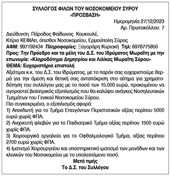 Ευχαριστήριο για την χρηματοδότηση του Συλλόγου Φίλων του Νοσοκομείου Σύρου προς το Ίδρυμα Μωραΐτη Πέμπτη 28 Δεκεμβρίου 2023 - 14:30 Συντάκτης: Ρένα Ρούσσου Κείμενο Βλέπε εικόνα. Αριθμός Φύλλου 6276 Κατηγορία Ευχαριστήριο
