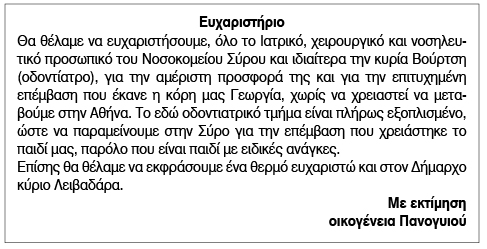 Ευχαριστήριο προς Νοσοκομείο Σύρου από οικογένεια Παντογυιού Τετάρτη 18 Ιανουαρίου 2023 - 13:25 Συντάκτης: Ρένα Ρούσσου Κείμενο Βλέπε εικόνα. Αριθμός Φύλλου 6044 Κατηγορία Ευχαριστήριο
