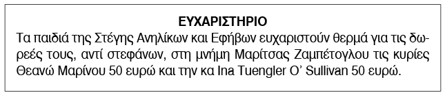 Ευχαριστήριο Στέγης Ανηλίκων Παρασκευή 23 Φεβρουαρίου 2024 - 10:49 Συντάκτης: Ρένα Ρούσσου Κείμενο Βλέπε εικόνα Αριθμός Φύλλου 6314 Κατηγορία Ευχαριστήριο