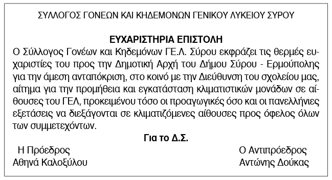 Ευχαριστήριο Συλλόγου Γονέων Γενικού Λυκείου Σύρου Τρίτη 20 Μαΐου - 12:12 Συντάκτης: Ρένα Ρούσσου Κείμενο Βλέπε εικόνα Αριθμός Φύλλου 6610 Κατηγορία Ευχαριστήριο