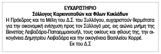 Ευχαριστήριο Συλλόγου Καρκινοπαθών και φίλων Κυκλάδων Τετάρτη 13 Οκτωβρίου 2021 - 14:15 Συντάκτης: Ρένα Ρούσσου Κείμενο Βλέπε εικόνα. Αριθμός Φύλλου 5729 Κατηγορία Ευχαριστήριο