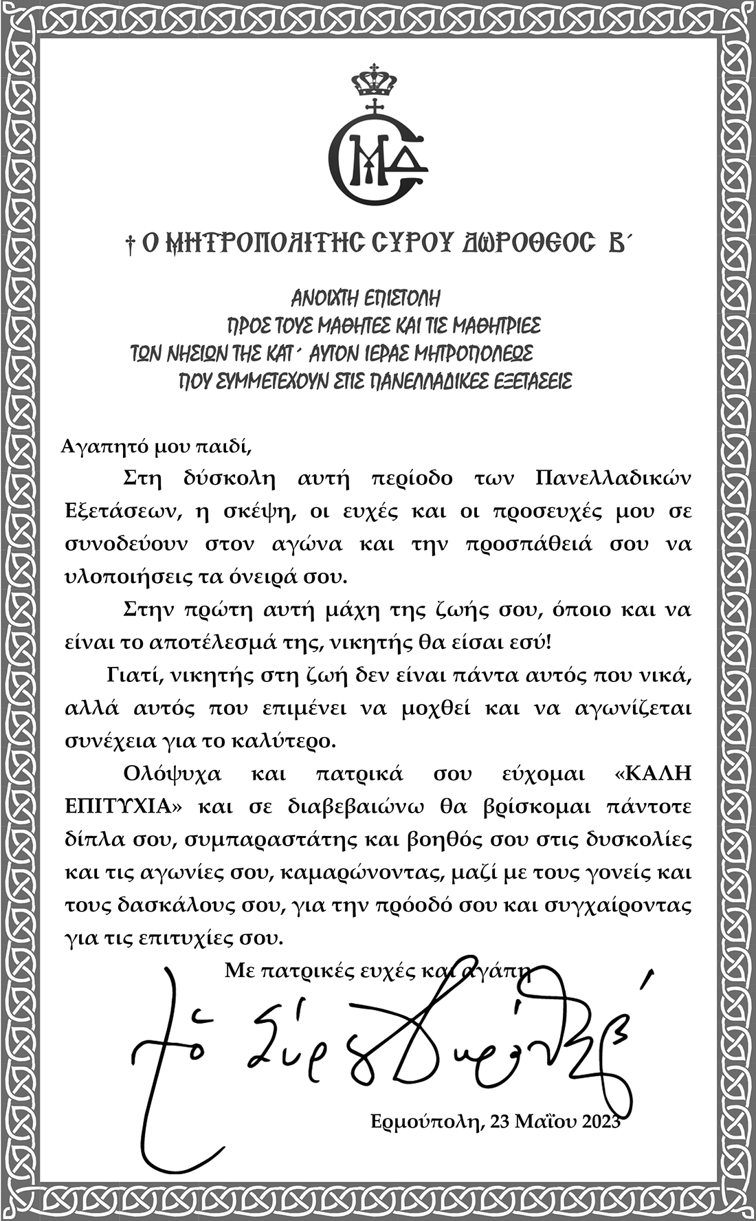 Ευχές Μητροπολίτη προς τους μαθητές και τις μαθήτριες που θα συμμετάσχουν στις Πανελλαδικές εξετάσεις 2023 Πέμπτη 25 Μαΐου 2023 - 14:46 Συντάκτης: Ρένα Ρούσσου Κείμενο Βλέπε εικόνα. Αριθμός Φύλλου 6131 Κατηγορία Ανακοίνωση