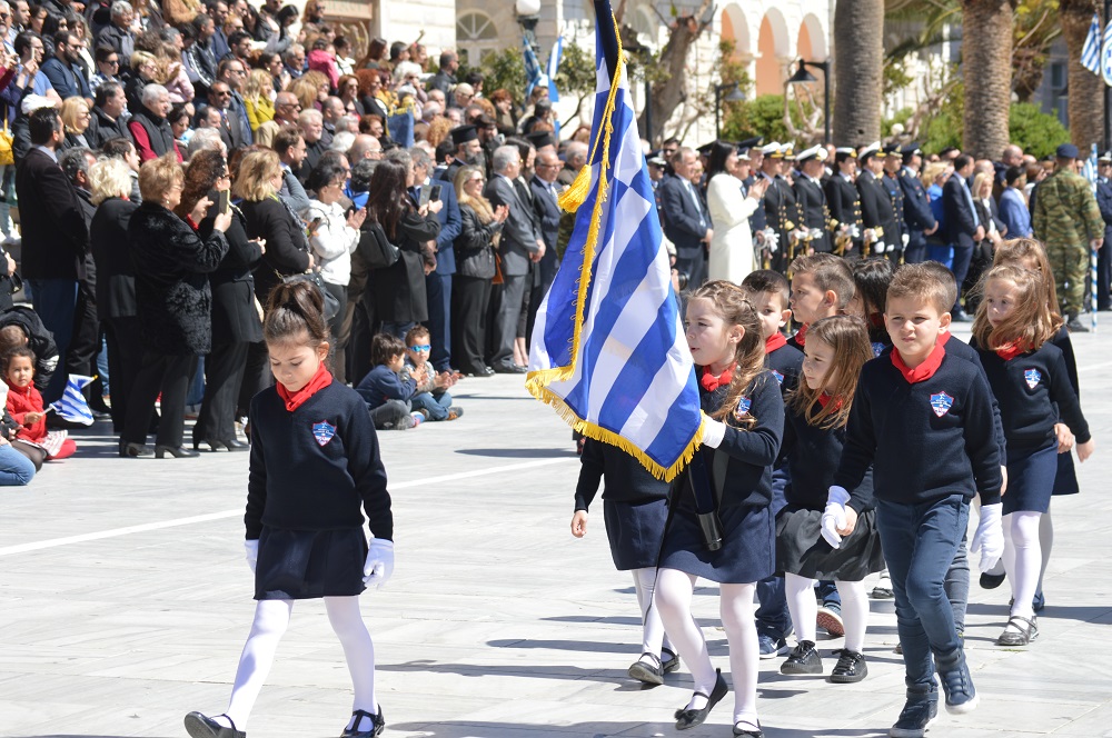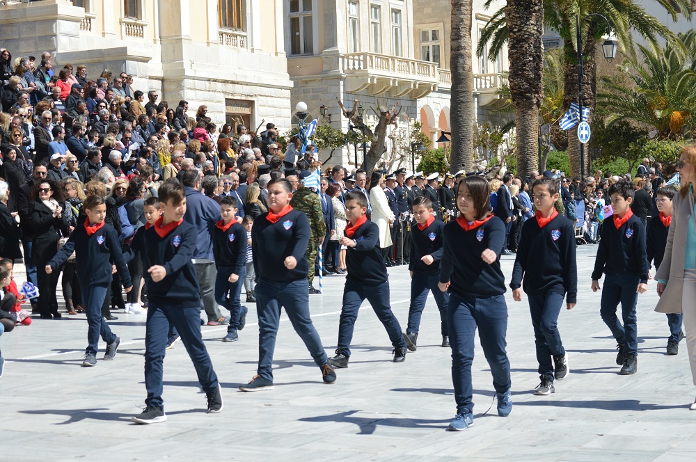 Τα αειθαλή μηνύματα της Επανάστασης του 1821, ότι ο άνθρωπος νοείται άνθρωπος μόνο ως έθνος και ότι η ανθρώπινη ζωή νοείται μόνο σε συνθήκες ελευθερίας, αναδείχθηκαν αρχικά μέσα από τις εορταστικές εκδηλώσεις των σχολείων Πρωτοβάθμιας και Δευτεροβάθμιας Εκπαίδευσης και της Ακαδημίας Εμπορικού Ναυτικού Σύρου, οι οποίες πραγματοποιήθηκαν το πρωί της Παρασκευής 22 Μαρτίου 2019.