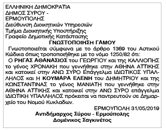 Γνωστοποίηση Γάμου Αθανασίου Ρήγα και Ελένης Κουμαρά Τρίτη 4 Ιουνίου 2019 - 12:56 Συντάκτης: Κατερίνα Βιδάλη Κείμενο Βλέπε εικόνα Αριθμός Φύλλου 5139 Κατηγορία Γνωστοποίηση Γάμου