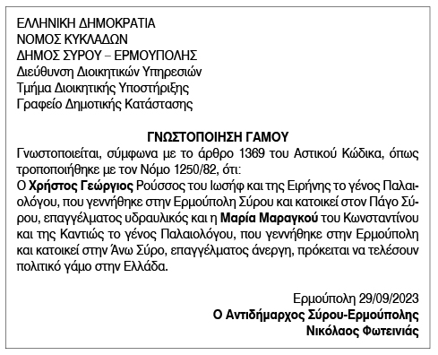 Γνωστοποίηση γάμου για Χρήστο Γεώργιο Ρούσσο και Μαρία Μαραγκού Τρίτη 3 Οκτωβρίου 2023 - 14:56 Συντάκτης: Ρένα Ρούσσου Κείμενο Βλέπε εικόνα. Αριθμός Φύλλου 6217 Κατηγορία Γνωστοποίηση Γάμου