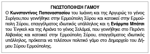 Γνωστοποίηση γάμου για Κωνσταντίνο Παπαναστασίου και Ενάρμπα Μπάτσι Τρίτη 3 Ιουνίου - 16:41 Συντάκτης: Ρένα Ρούσσου Κείμενο Βλέπε εικόνα. Αριθμός Φύλλου 6620 Κατηγορία Γνωστοποίηση Γάμου