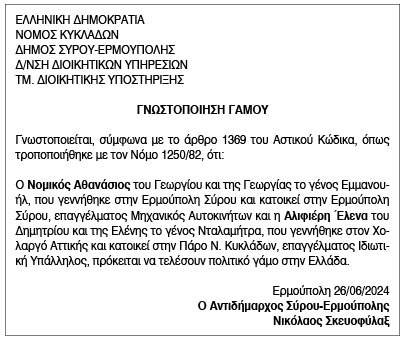 Γνωστοποίηση γάμου για Νομικό Αθανάσιο και Αλιφιέρη Έλενα Παρασκευή 28 Ιουνίου 2024 - 13:59 Συντάκτης: Ρένα Ρούσσου Κείμενο Βλέπε εικόνα. Αριθμός Φύλλου 6399 Κατηγορία Γνωστοποίηση Γάμου