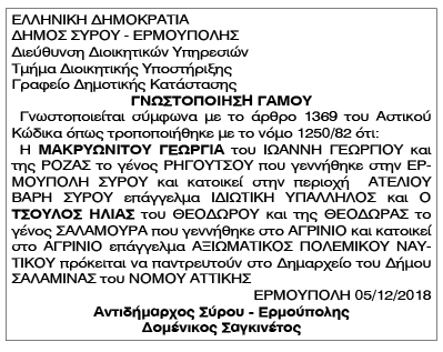 Γνωστοποίηση Γάμου Μακρυωνίτου Γεωργίας και Τσούλου Ηλία Παρασκευή 7 Δεκεμβρίου 2018 - 11:41 Συντάκτης: Κατερίνα Βιδάλη Κείμενο Βλέπε εικόνα Αριθμός Φύλλου 5021 Κατηγορία Γνωστοποίηση Γάμου