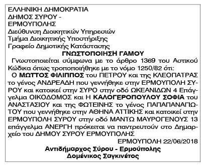 Γνωστοποίηση γάμου Μώττου Φίλιππου και Καλογεροπούλου Σοφίας Τετάρτη 27 Ιουνίου 2018 - 14:59 Συντάκτης: Κατερίνα Βιδάλη Κείμενο Βλέπε εικόνα Αριθμός Φύλλου 4906 Κατηγορία Γνωστοποίηση Γάμου
