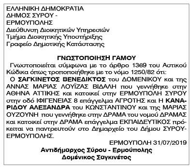 Γνωστοποίηση γάμου Σαγκινέτου Βενέδικτου και Καναρίδου Αλεξάνδρα Πέμπτη 1 Αυγούστου 2019 - 13:04 Συντάκτης: Πέννυ Συριανού Κείμενο Βλέπε εικόνα Αριθμός Φύλλου 5180 Κατηγορία Γνωστοποίηση Γάμου
