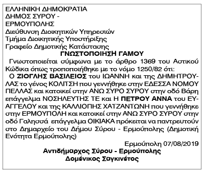 Γνωστοποίηση γάμου Ζιόγλη Βασιλείου και Πέτρου Άννας Πέμπτη 8 Αυγούστου 2019 - 11:43 Συντάκτης: Κατερίνα Βιδάλη Κείμενο Βλέπε εικόνα Αριθμός Φύλλου 5185 Κατηγορία Γνωστοποίηση Γάμου