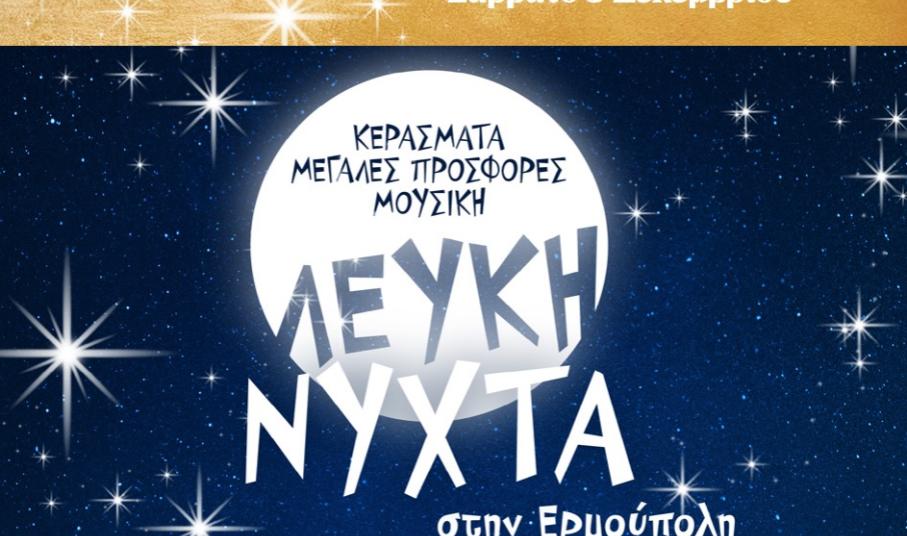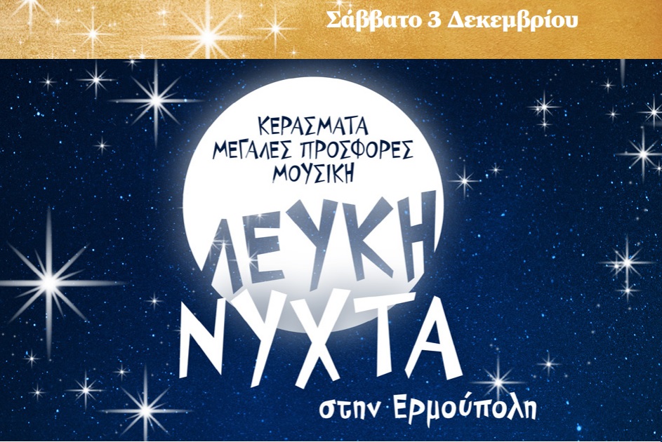 Το Σάββατο 3 Δεκεμβρίου στην εμπορική “καρδιά” της Ερμούπολης, από τις 18:00 ως τις 00:00 ο Εμπορικός Σύλλογος Σύρου διοργανώνει μια βραδιά γιορτής και εκδηλώσεων με την ονομασία «Λευκή Νύχτα 2022». Τα εμπορικά καταστήματα της Ερμούπολης θα μείνουν ανοιχτά έως τα μεσάνυχτα, με μεγάλες προσφορές, μουσική, κεράσματα και διασκεδαστές.