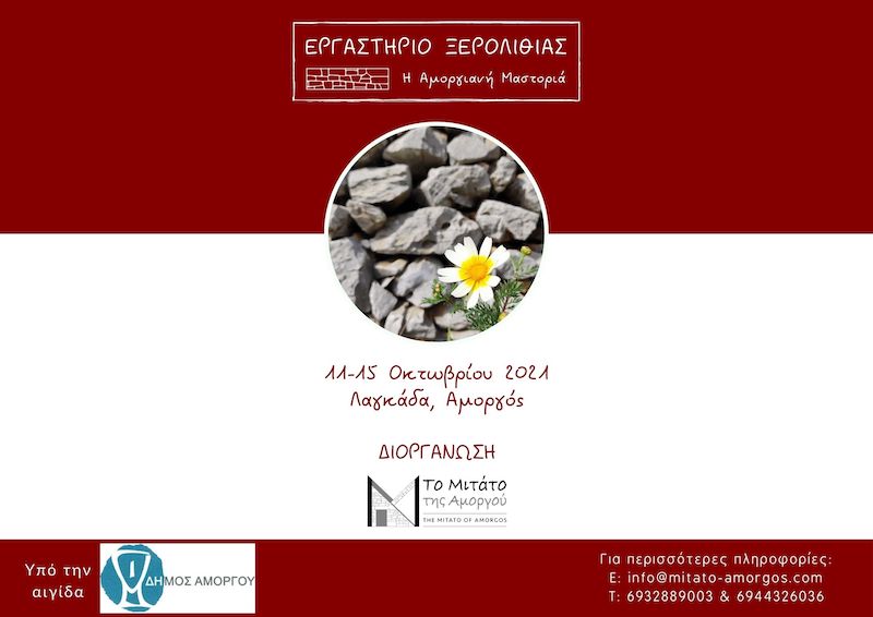Την ευκαιρία να μαθητεύσουν δίπλα σε έμπειρους Αμοργιανούς μαστόρους θα έχουν οι συμμετέχοντες στο Εργαστήριο Ξερολιθιάς που διοργανώνεται από την ΑΜΚΕ “Το Μιτάτο της Αμοργού” και θα διεξαχθεί από 11 έως 15 Οκτωβρίου 2021 στο όμορφο νησί των Κυκλάδων, υπό την αιγίδα του Δήμου Αμοργού.