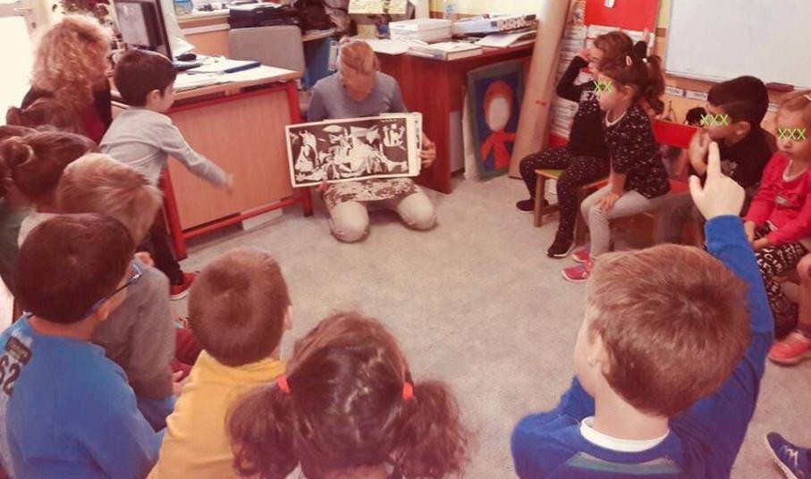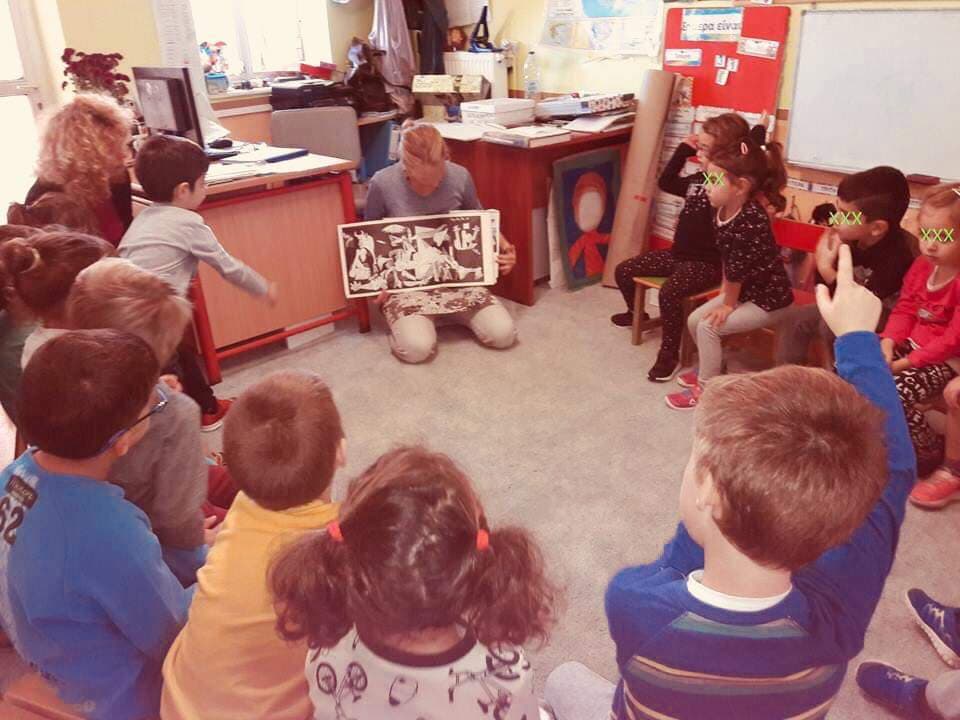 Στην έναρξη του εικαστικού εργαστηρίου, η υπεύθυνη του ΔΕΕΠΣ, Eileen Botsford – Βελισσαροπούλου συζήτησε με τα παιδιά για τον πόλεμο και την ειρήνη. Η ίδια αναφέρθηκε στην ανάγκη των καλλιτεχνών να καταπιάνονται και με θέματα που τους γεννούν πόνο, όπως ακριβώς έκανε ο Πικάσο, ζωγραφίζοντας τη Guernica, έναν πίνακα που αποτυπώνει τις επιπτώσεις του πολέμου τόσο στους ανθρώπους όσο και στα ζώα. Επιπλέον μίλησαν για τα σύμβολα της ειρήνης σε όλο τον κόσμο, την καταγωγή και το έργο του Πικάσο, αλλά και για την πόλη Γκουέρνικα, η οποία βομβαρδίστηκε κατά τη διάρκεια του Ισπανικού Εμφυλίου Πολέμου.