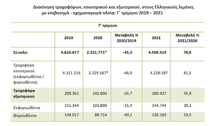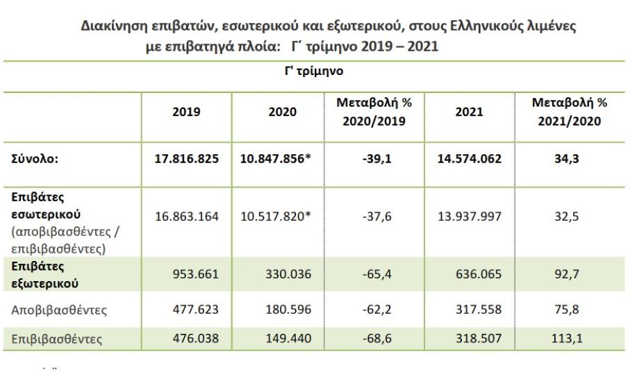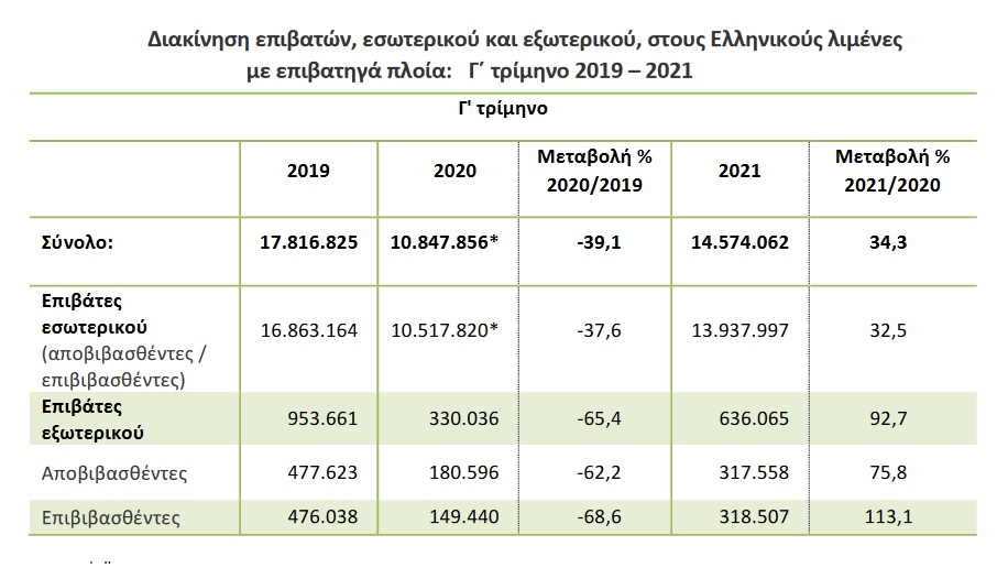 - Η συνολική διακίνηση επιβατών στους Ελληνικούς λιμένες το γ ́ τρίμηνο 2021 σε σύγκριση με το γ ́ τρίμηνο του 2020 παρουσίασε αύξηση κατά 34,3%, ενώ κατά την αντίστοιχη σύγκριση του γ ́ τριμήνου 2020 προς το γ ́ τρίμηνο 2019 παρατηρήθηκε μείωση κατά 39,1%.
