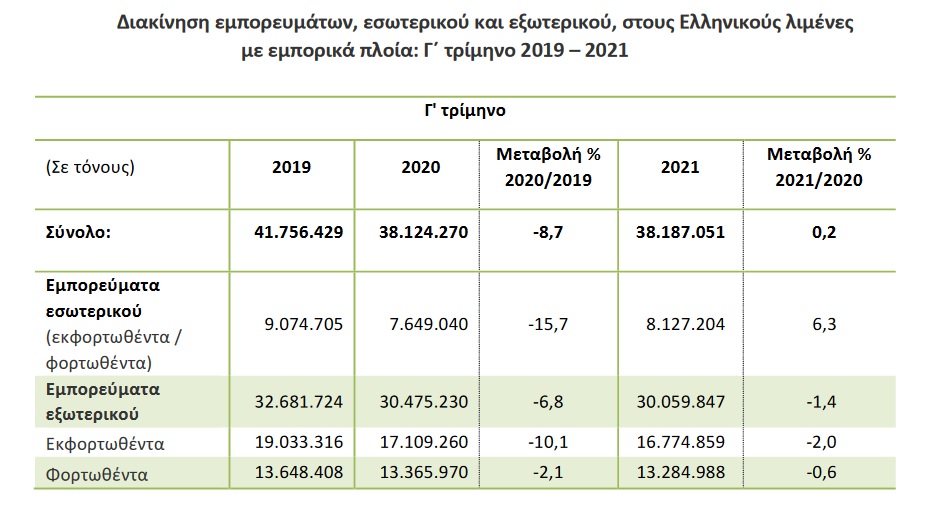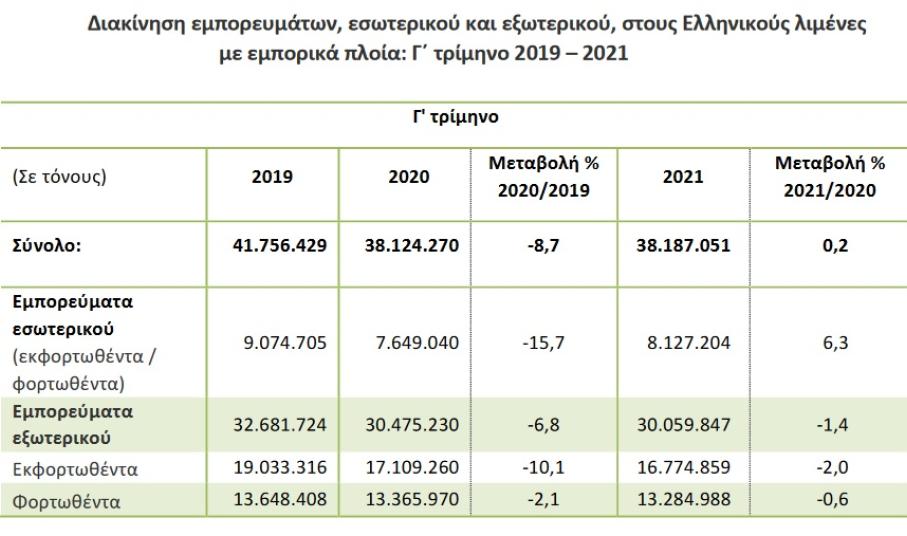 - Η συνολική διακίνηση εμπορευμάτων στους Ελληνικούς λιμένες το γ ́ τρίμηνο 2021 σε σύγκριση με το γ ́ τρίμηνο του 2020 παρουσίασε αύξηση κατά 0,2%, ενώ κατά την αντίστοιχη σύγκριση του γ ́ τριμήνου 2020 προς το γ ́ τρίμηνο 2019 παρατηρήθηκε μείωση κατά 8,7%.