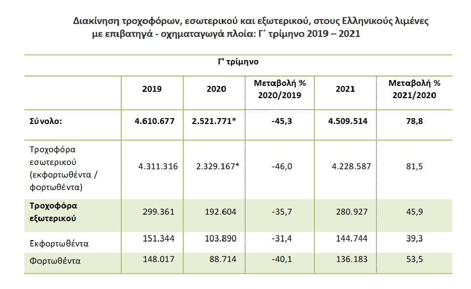 Η Ελληνική Στατιστική Αρχή (ΕΛΣΤΑΤ) ανακοινώνει τα αποτελέσματα διακίνησης επιβατών, εμπορευμάτων και κινητών μονάδων στους Ελληνικούς λιμένες του γ ́ τριμήνου 2021.