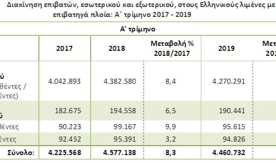 Ειδικότερα: Η συνολική διακίνηση επιβατών στους Ελληνικούς λιμένες το Α ́ τρίμηνο 2019 σε σύγκριση με το Α ́ τρίμηνο του 2018 παρουσίασε μείωση κατά 2,5%. To αντίστοιχο διάστημα 2018-2017 παρατηρήθηκε αύξηση στη συνολική διακίνηση επιβατών κατά 8,3%.