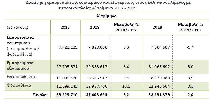 Η συνολική διακίνηση εμπορευμάτων στους Ελληνικούς λιμένες το Α ́ τρίμηνο 2019 σε σύγκριση με την διακίνηση του Α ́ τριμήνου 2018 παρουσίασε αύξηση κατά 2,0%. To αντίστοιχο διάστημα 2018-2017 παρατηρήθηκε αύξηση στη συνολική διακίνηση εμπορευμάτων κατά 6,2%.