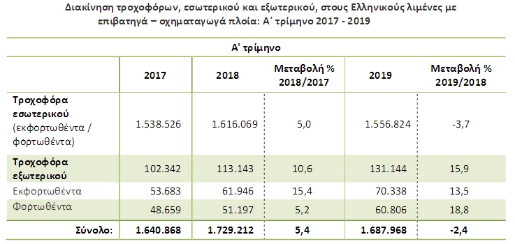 Η Ελληνική Στατιστική Αρχή (ΕΛΣΤΑΤ) ανακοινώνει τα αποτελέσματα διακίνησης επιβατών, εμπορευμάτων και κινητών μονάδων στους Ελληνικούς λιμένες του Α’ τριμήνου 2019.