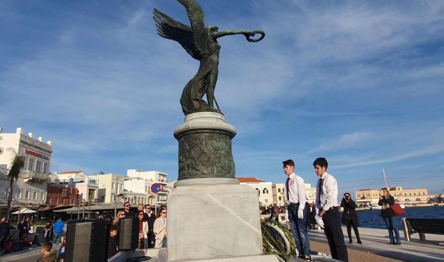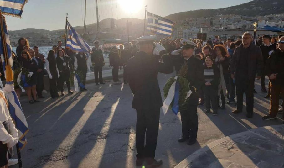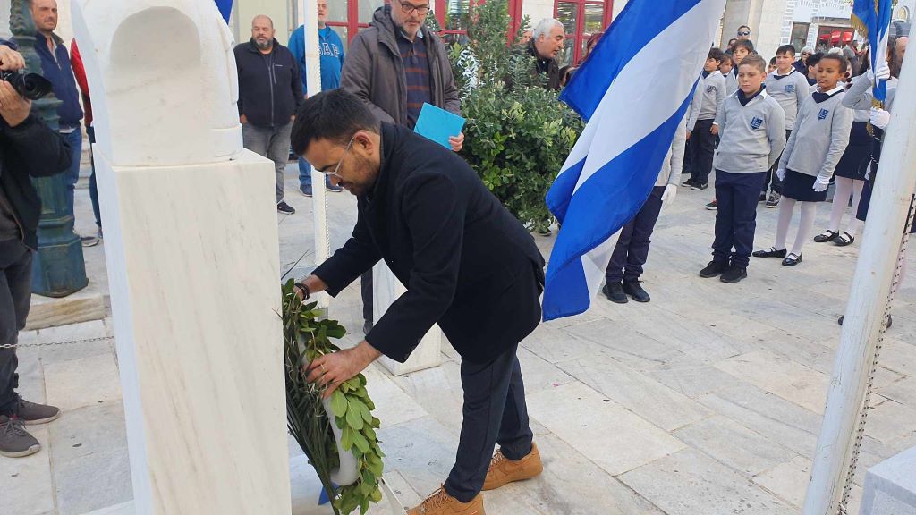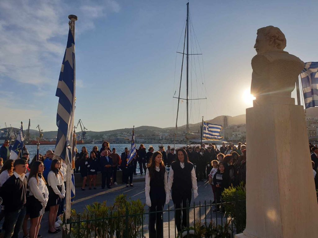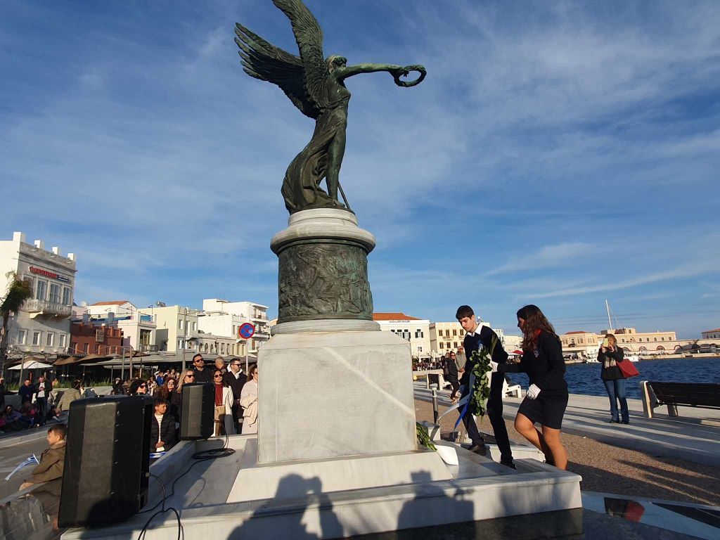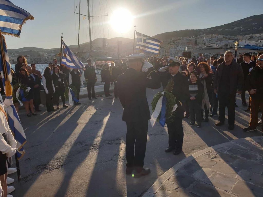 Νέοι και νέες, παρουσία του αντιπεριφερειάρχη Κυκλάδων, Γιώργου Λεονταρίτη, του δημάρχου Σύρου-Ερμούπολης Αλέξη Αθανασίου, του εντεταλμένου δημοτικού συμβούλου του γραφείου Παιδείας, Ιωσήφ Ρούσσου και μελών της δημοτικής αρχής, κατέθεσαν στεφάνια στα μνημεία της Ερμούπολης, αποδίδοντας τιμή στον αγώνα των προγόνων μας.