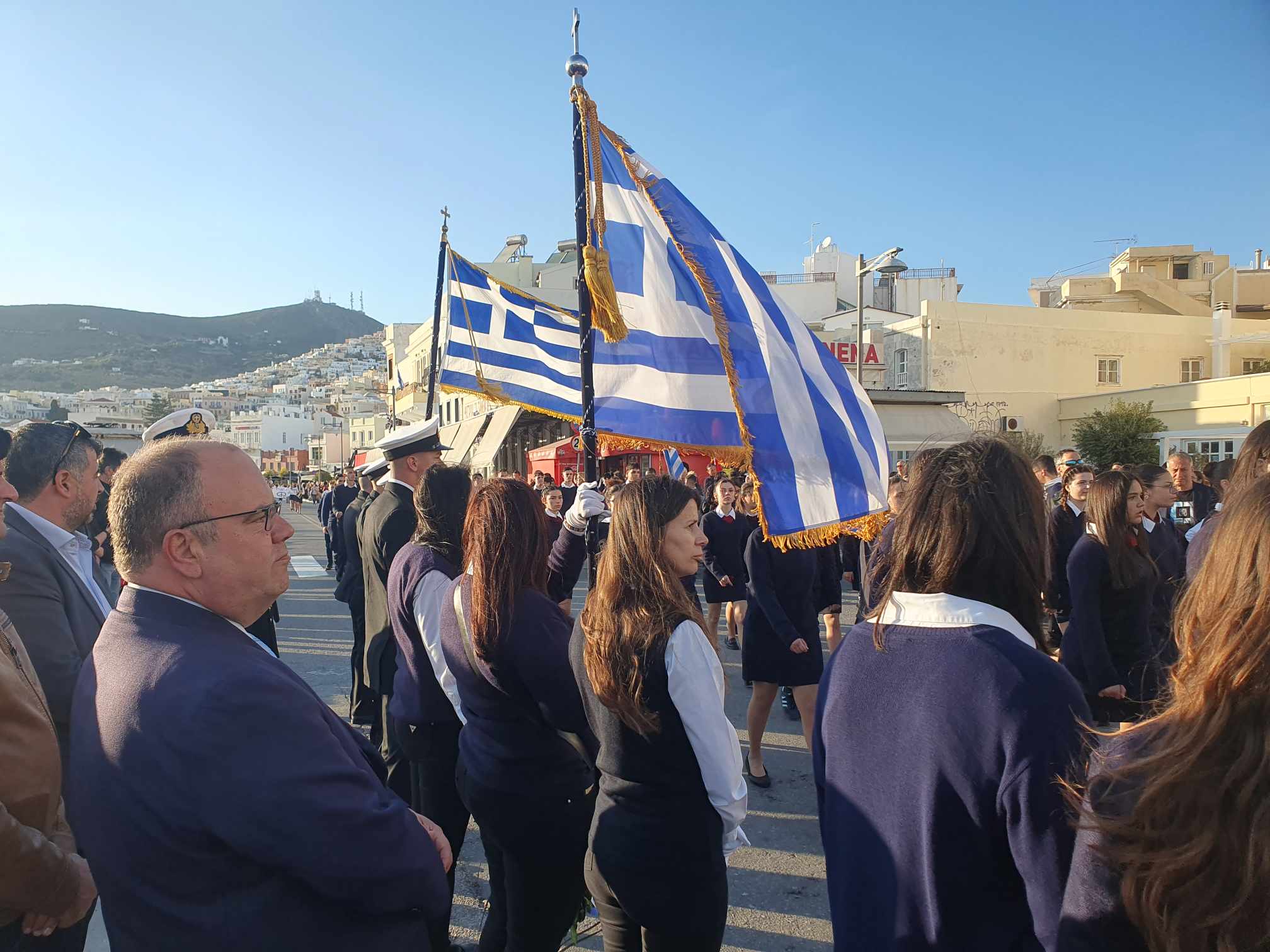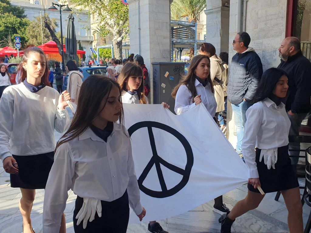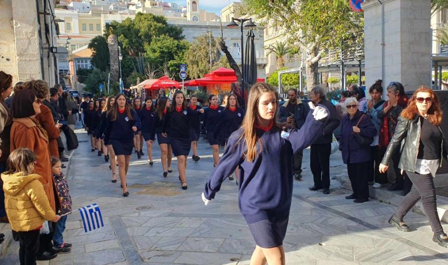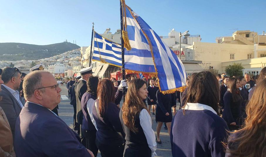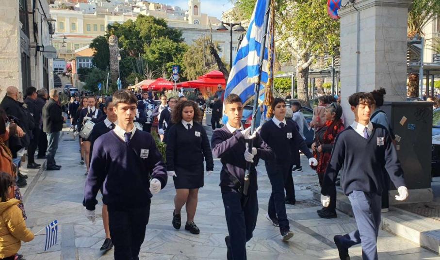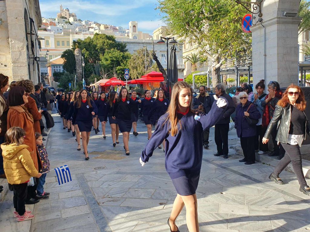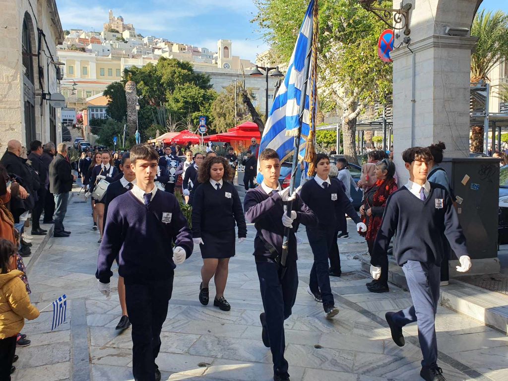 Η πομπή των μαθητών, των σπουδαστών και των προσκόπων, μέσω των κύριων οδών της πόλης κατευθύνθηκε στο Ηρώο των Πεσόντων στην πλατεία Ηρώων, όπου έγινε κατάθεση στεφάνων από τον χωρικό αντιπεριφερειάρχη Κυκλάδων, τους μαθητές του 4ου Πειραματικού Δημοτικού Σχολείου Ερμούπολης και του 5ου Δημοτικού Σχολείου Ερμούπολης, του Βαμβακάρειου Λυκείου των Εκπαιδευτηρίων "ΔΕΛΑΣΑΛ" Σύρου, του ΕΠΑΛ Σύρου, του Εσπερινού ΕΠΑΛ Σύρου, του Ενιαίου Ειδικού Επαγγελματικού Γυμνασίου – Λυκείου Σύρου και τους σπουδαστές και τις σπουδάστριες της Σχολής Ανώτερης Επαγγελματικής Κατάρτισης του Γενικού Νοσοκομείου Σύρου.