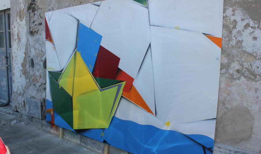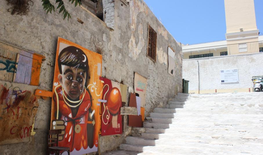 Από την Τρίτη 5 Ιουλίου, τρία graffiti που πραγματεύονται τη διάβαση στην Ευρώπη των ημερών μας συμβάλλουν στην ανάπτυξη ενός δημόσιου διαλόγου μεταξύ της τέχνης του δρόμου και της τοπικής κοινωνίας της Σύρου με θέμα το προσφυγικό. Τα έργα αυτά δημιουργήθηκαν σταδιακά σε τρία σημεία της Ερμούπολης, στο Χειμερινό Κινηματογράφο Παλλάς, στο Ρολόι του 1ου Δημοτικού Σχολείου Ερμούπολης και στο Λιμάνι απέναντι από το Ξενοδοχείο Ερμής.