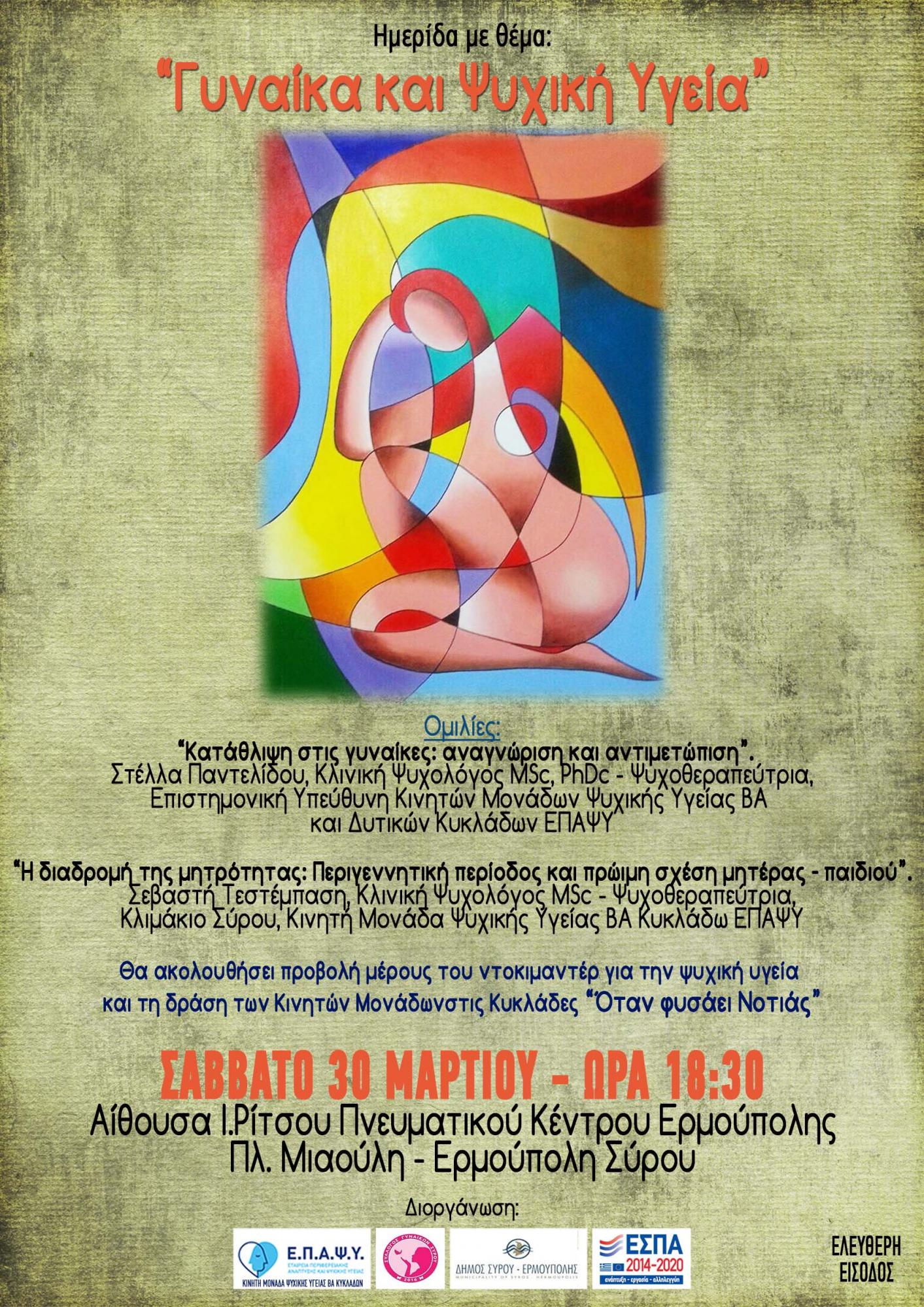 Η Κινητή Μονάδα Ψυχικής Υγείας ΒΑ Κυκλάδων, σε συνεργασία με το Δήμο Σύρου - Ερμούπολης και το Σύλλογο Γυναικών Σύρου, διοργανώνει Ημερίδα με θέμα «Γυναίκα και Ψυχική Υγεία» στις 30/03/2019 στην Σύρο , στις 18:30 στην αίθουσα Ι. Ρίτσου Πνευματικού Κέντρου Ερμούπολης. Πλατεία Μιαούλη, Ερμούπολη.