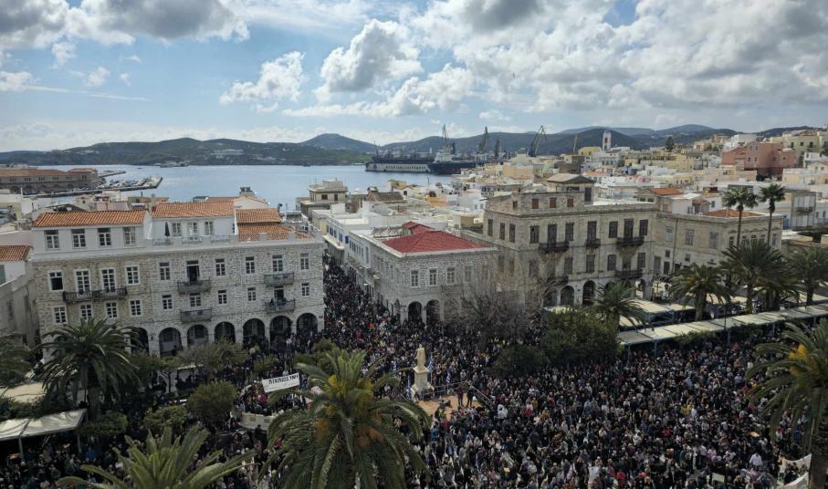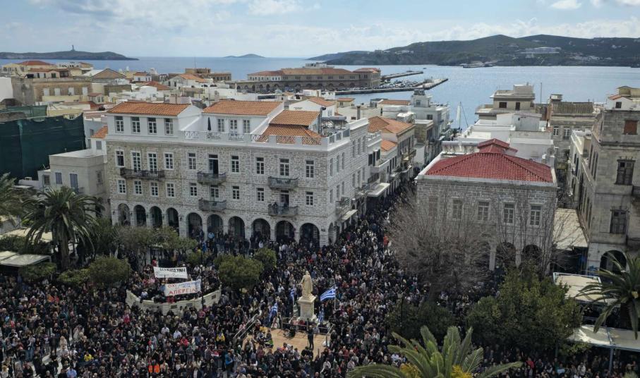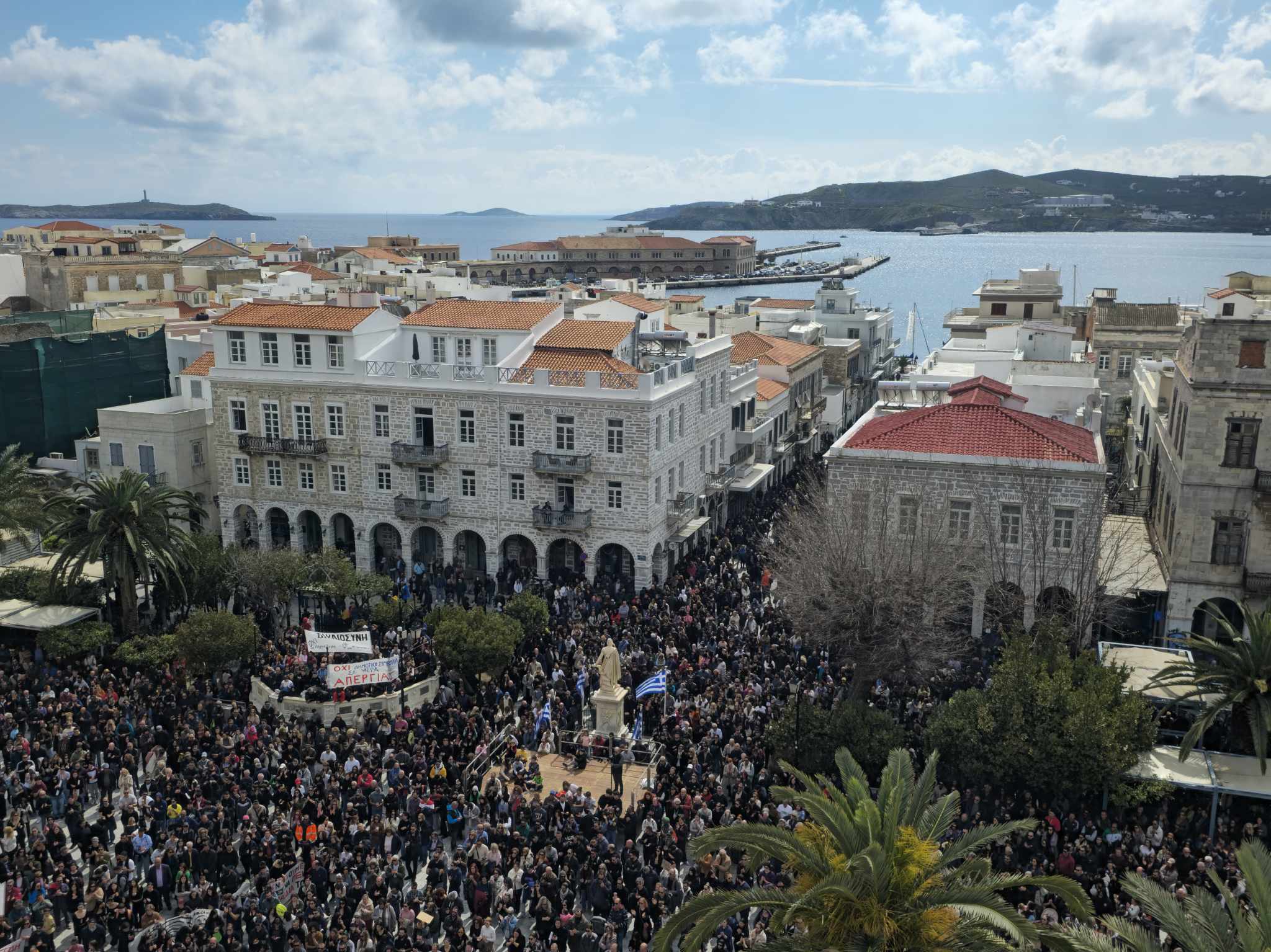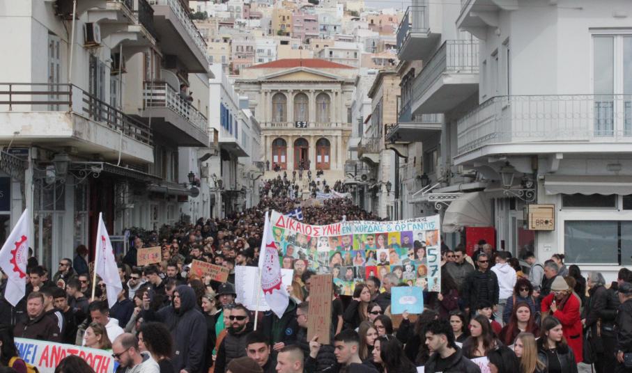 Περισσότεροι από 4.500 πολίτες στη Σύρο, βγήκαν στον δρόμο και κινητοποιήθηκαν το πρωί της Παρασκευής, συμπαραστεκόμενοι στις οικογένειες και τους συγγενείς των 57 αδικοχαμένων ανθρώπων της τραγωδίας του σιδηροδρομικού δυστυχήματος των Τεμπών, ζητώντας να αποδοθεί δικαιοσύνη.