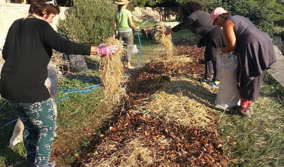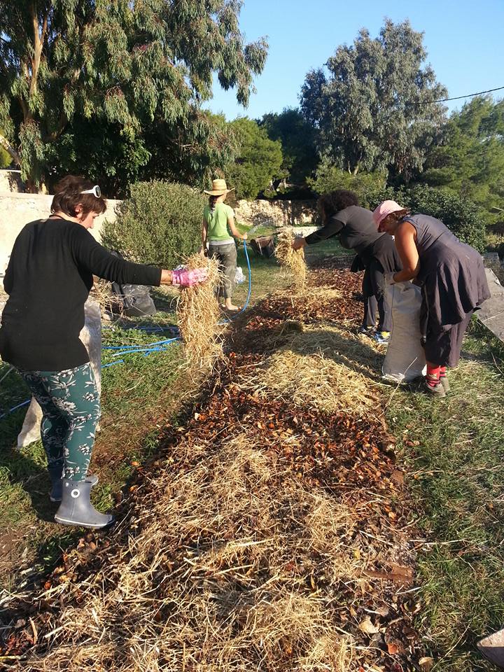 Την πρώτη ημέρα, οι συμμετέχοντας σχεδίασαν και δημιούργησαν ένα παρτέρι πάνω στη γη (χωρίς σκάψιμο) "χτίζοντας χώμα" με πολλαπλές στρώσεις από φυσικά και μόνο υλικά, αποτρέποντας ταυτόχρονα τα αγριόχορτα.