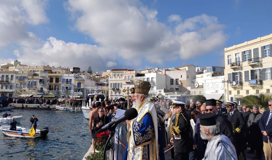 Για τη σημαντικότητα της Σύρου στην οικονομική και κοινωνική ανάπτυξη ολόκληρου του Αιγαίου, έκανε λόγο, απευθυνόμενος στους παρευρισκομένους, ο μητροπολίτης Σύρου, Δωρόθεος Β', αποδίδοντας στη συνέχεια τα συγχαρητήρια και ένα μικρό ενθύμιο στον νεαρό, Βασίλη Κορφιάτη, ο οποίος βούτηξε για πρώτη φορά στα παγωμένα νερά και κατάφερε να πιάσει τον σταυρό από τη θάλασσα.