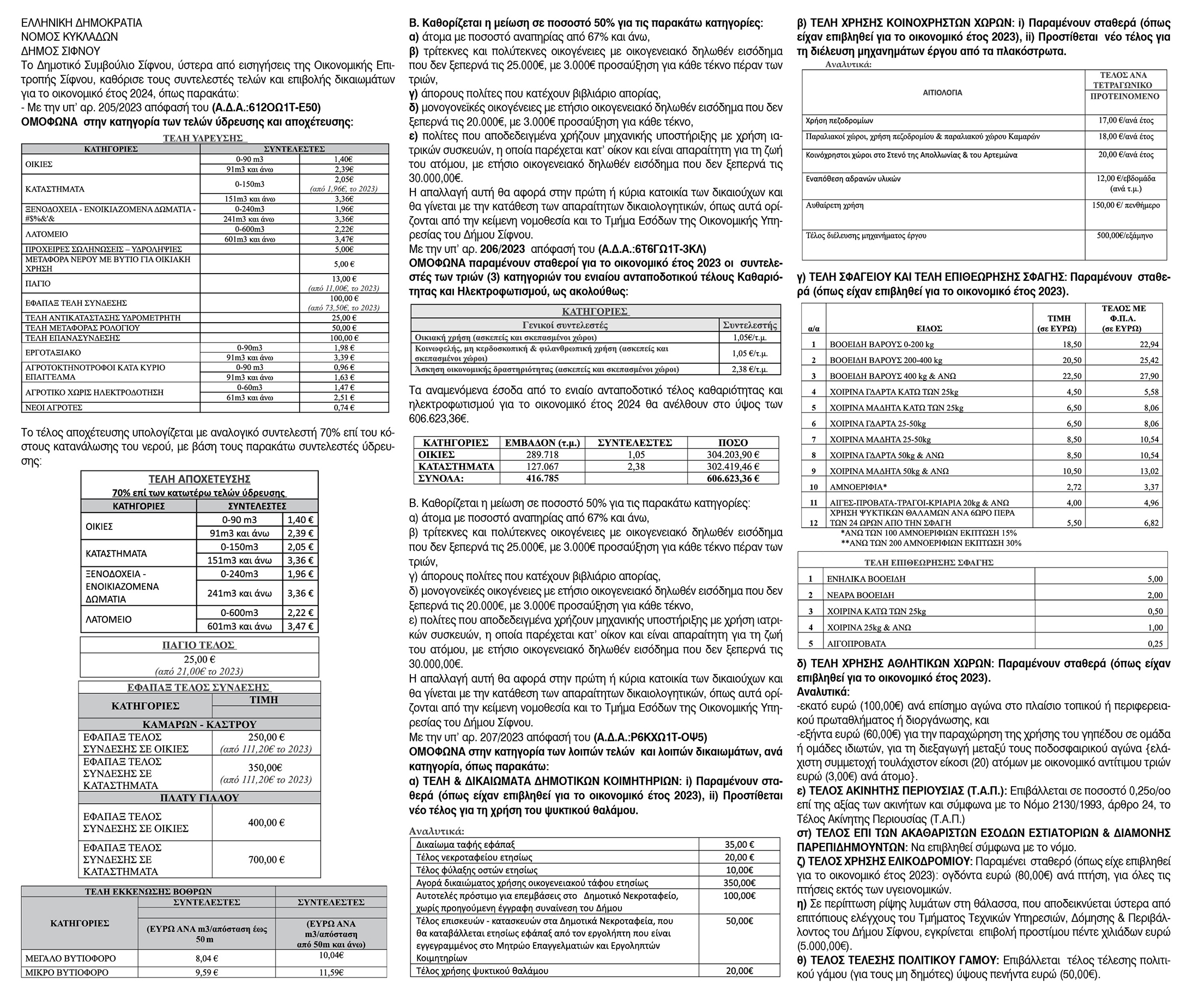 Καθορισμός συντελεστών τελών και επιβολή δικαιωμάτων για το έτος 2024, από το Δήμο Σίφνου Πέμπτη 18 Ιανουαρίου 2024 - 14:02 Συντάκτης: Ρένα Ρούσσου Κείμενο Βλέπε εικόνα. Αριθμός Φύλλου 6289 Κατηγορία Απόφαση