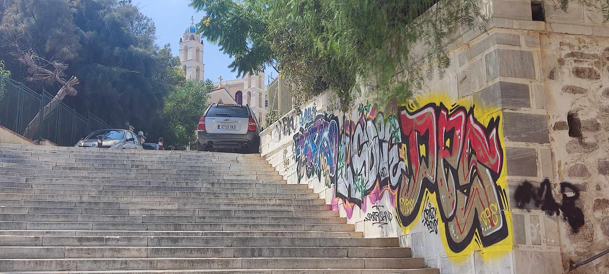 Συνεχίζεται ο κύκλος καταστροφών και αισθητικής υποβάθμισης της Ερμούπολης και του ιστορικού κέντρου, αφού σε διάφορα κτήρια, νέα συνθήματα και γκράφιτι, προδίδουν την αδιαφορία νέων για την αρχιτεκτονική κληρονομιά.