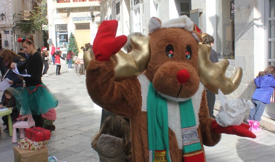 Όπως κάθε χρόνο, έτσι και φέτος, στη γιορτινή Ερμούπολη καλωσόριζαν το κοινό ο Χιονάνθρωπος, το Χριστουγεννιάτικο Δέντρο, ο Τάρανδος, ο Άγιος Βασίλης και ο ξυλοπόδαρος, ο οποίος συνομίλησε με τα παιδιά και μοίρασε μπαλόνια.