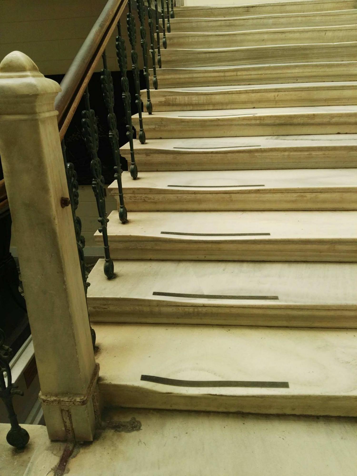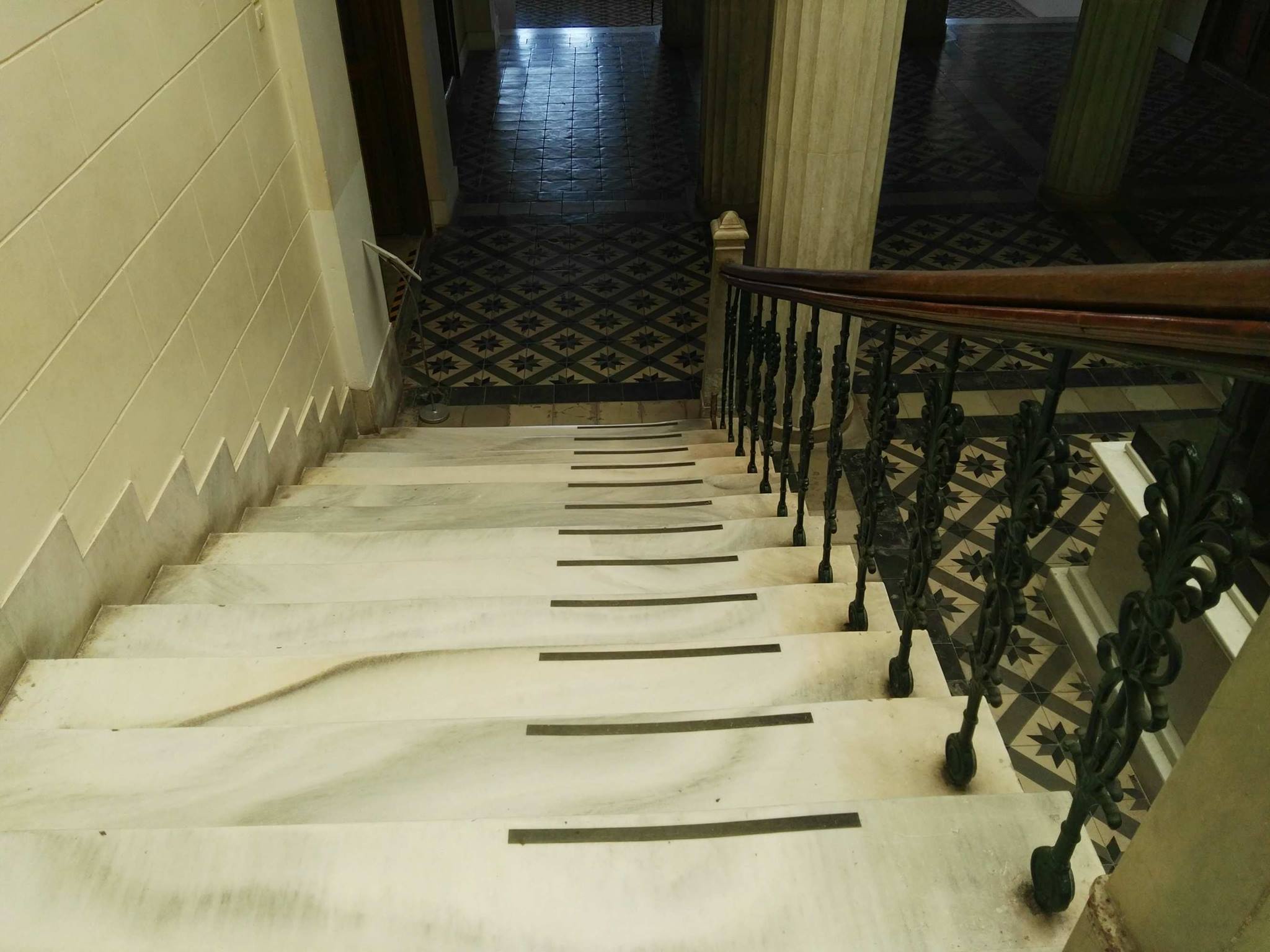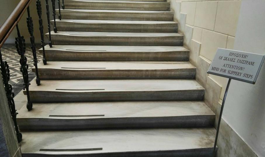 Πρέπει να σημειωθεί πως, η εν λόγω κλίμακα που χαρακτηρίζεται για την ιδιαίτερη τεχνοτροπία της και είναι σχεδόν μοναδική σε κτίρια της χώρας που δεν έχει βάση, δεν “τραυματίζεται” αισθητικά από την τοποθέτηση των αντιολισθητικών ταινιών, γεγονός πολύ σημαντικό.