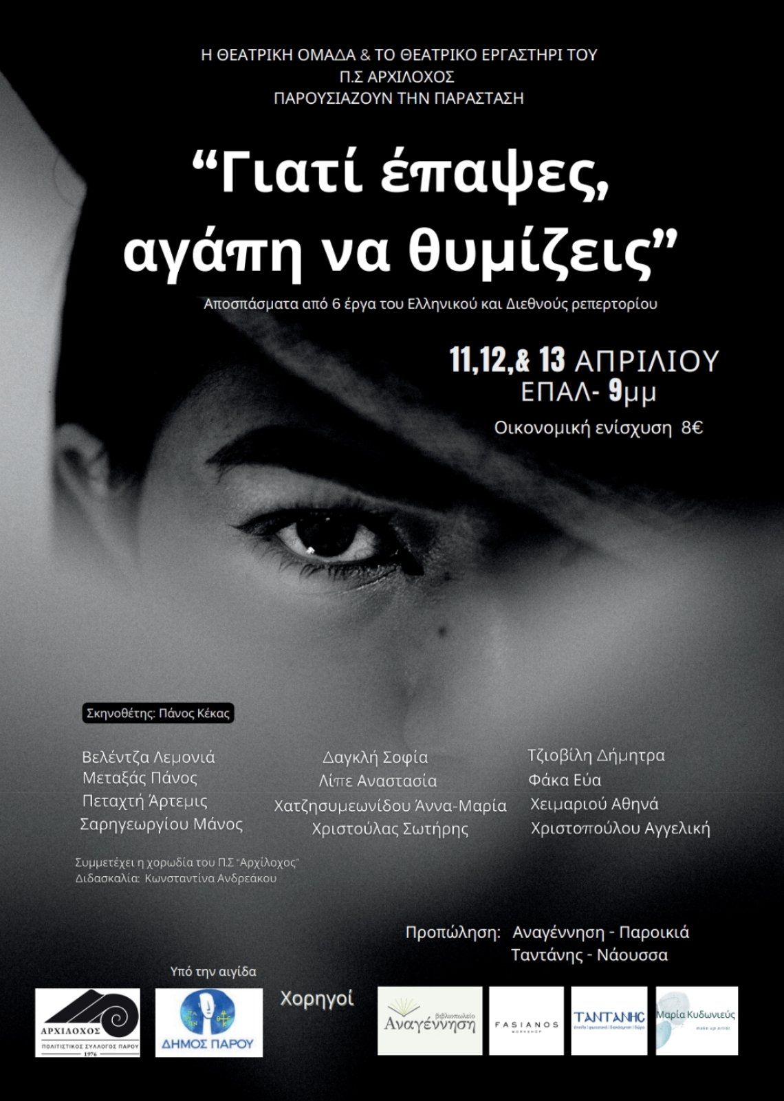 Ο λόγος για το έργο με τον τίτλο "Γιατί έπαψες, αγάπη να θυμίζεις", σε σκηνοθεσία του Πάνου Κέκα και το οποίο θα παρουσιαστεί στο ΕΠΑΛ Πάρου.