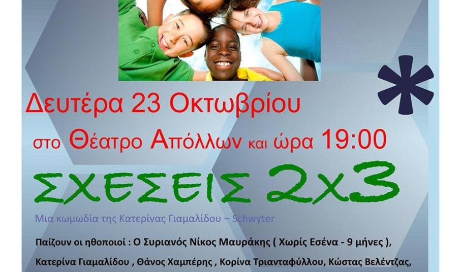 Το έργο της κ. Γιαμαλίδου με τίτλο «Σχέσεις 2 x 3», στο οποίο συμμετέχει, μεταξύ άλλων και ο Συριανός ηθοποιός Νίκος Μαυράκης, γνωστός από τις τηλεοπτικές «Χωρίς εσένα» και «Εννέα μήνες» θα παρουσιαστεί τη Δευτέρα 23 Οκτωβρίου για την οικονομική ενίσχυση της Στέγης Ανηλίκων και Εφήβων Σύρου.