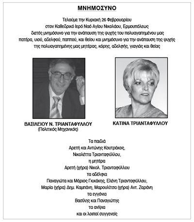 Μνημόσυνο για Βασίλειο και Κατίνα Τριανταφύλλου Παρασκευή 24 Φεβρουαρίου 2023 - 14:27 Συντάκτης: Ρένα Ρούσσου Κείμενο Βλέπε εικόνα. Αριθμός Φύλλου 6071 Κατηγορία Μνημόσυνο