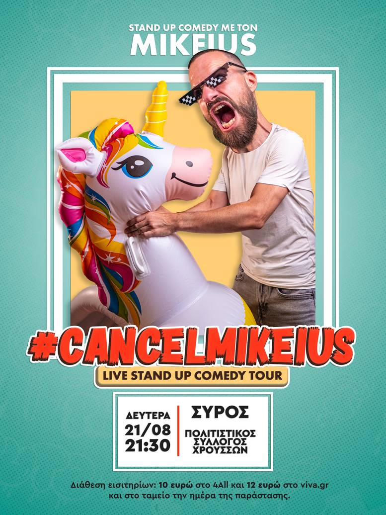 O Mikeius έρχεται σε Σύρο και Τήνο με τα πιο Politically Incorrect κείμενα του σε μία ξεκαρδιστική παράσταση! Σύρος Δευτέρα 21 Αυγούστου 2023 Πολιτιστικός Σύλλογος Χρουσσών Ώρα έναρξης: 21.30 Διάθεση εισιτηρίων 10 ευρώ στο 4All Ερμούπολης και 12 ευρώ μέσω του viva.gr και στο ταμείο την ημέρα της παράστασης. Τήνος Τρίτη 22 Αυγούστου 2023 Ziba Beach Bar (Παραλία Αγίας Κυριακής) Ώρα έναρξης: 21.30 Διάθεση εισιτηρίων 10 ευρώ στο Ziba και 12 ευρώ μέσω του viva.gr και στο ταμείο την ημέρα της παράστασης. Ο Mikeius είναι κωμικός, youtuber και master της εκλαϊκευμένης επιστήμης. Πάνω από όλα όμως ένας άνθρωπος που…λατρεύεις να μισείς. Τον έχουμε απολαύσει μέσα από τις εκπομπές “ΜΠΡΑΦ”, “Θάψε το Σενάριο”, παρέα με τον Κώστα Μαλιάτση, “What the Fact”, “Broscar” καθώς και σε εκατοντάδες παραστάσεις σε όλη την Ελλάδα, την Κύπρο, ακόμη και την Αγγλία. Με θάρρος γνώμης, οξύνοια και καυστική γλώσσα, ο Mikeius δημιούργησε δική του σχολή σε ότι αφορά τις χιουμοριστικές απεικονίσεις μιας πραγματικότητας, στην οποία κάθε ένας από εμάς κάνει εκατοντάδες σκέψεις κάθε μέρα από τις οποίες πολύ λίγες τολμάμε να εκφράσουμε. Από την παράσταση του #CancelMikeius που θα πραγματοποιηθεί σε Σύρο και Τήνο, περνάνε θέματα, όπως η Cancel Culture,  η Πολιτική Ορθότητα αλλά και αγαπημένες του συζητήσεις, όπως τα 80’s και τα 90’s, οι σχέσεις των δύο  φύλων και δεκάδες λεπτομέρειες που συναντάει κάθε άνθρωπος στην καθημερινή του ζωή και περνάνε απαρατήρητες.  Τίποτα δεν ξεφεύγει από την κοφτερή ματιά του Mikeius και τίποτα φυσικά δεν μένει ασχολίαστο.