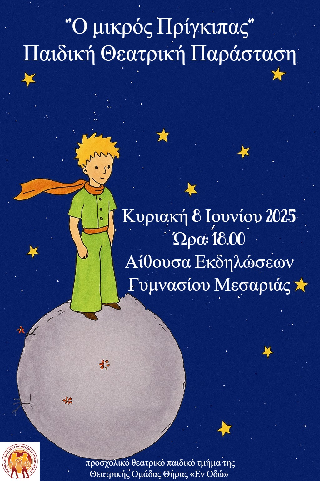 Το προσχολικό θεατρικό παιδικό τμήμα της Θεατρικής Ομάδας Θήρας «Εν Οδώ» σε συνεργασία με το Τμήμα Αθλητισμού και Πολιτισμού του Δήμου Θήρας, πραγματοποιούν μια μαγική παράσταση βασισμένη στο αγαπημένο έργο του Antoine de Saint-Exupéry, την Κυριακή 8 Ιουνίου στις 6 το απόγευμα, στην αίθουσα εκδηλώσεων του Γυμνασίου Μεσαριάς.