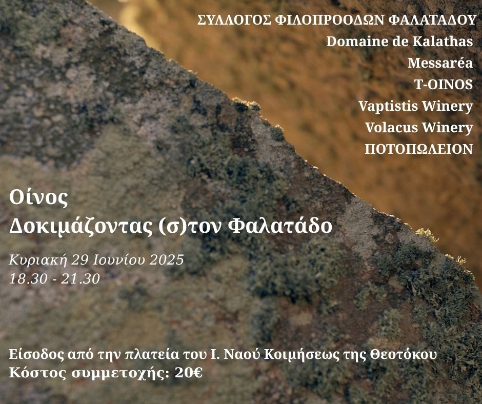 Ο Σύλλογος Φιλοπροόδων Φαλατάδου σε συνεργασία με τις εταιρείες κρασιών Domaine de Kalathas, Μessaréa, T-OINOS, Vaptistis Winery, Volacus Winery, διοργανώνουν ένα απόγευμα γευσιγνωσίας κρασιών κατά μήκος του χωριού.