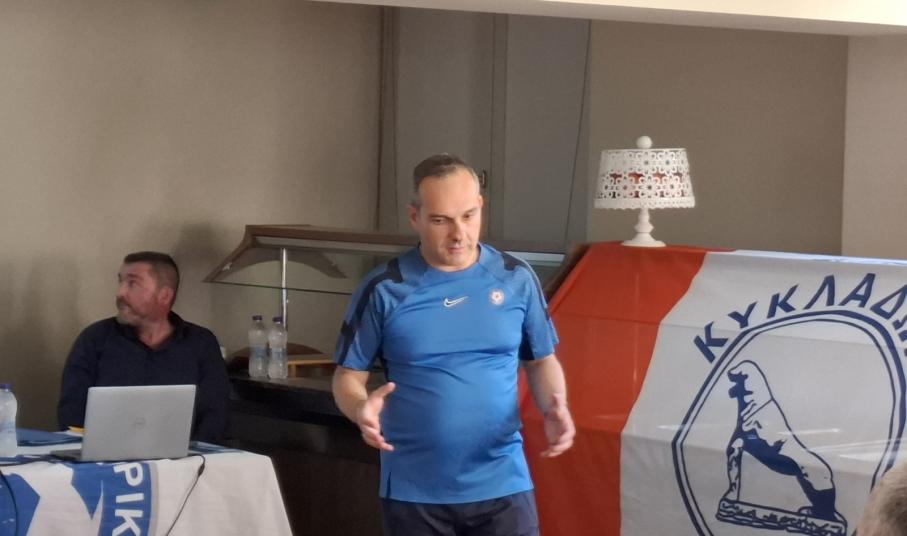 Από την πλευρά του, ο κ. Σίσκος ανέφερε στην του τοποθέτηση, τόνισε πως πως “από τη δική μου πλευρά θέλω να ευχαριστήσω την Ένωση Ποδοσφαιρικών Σωματείων Κυκλάδων όχι μόνο για τη διοργάνωση της συγκεκριμένης σχολής, αλλά γιατί από το 2019 που έχω την τύχη να βρίσκομαι στη θέση αυτή, έχουμε μία εξαιρετική συνεργασία. Το αναφέρω αυτό γιατί οι Κυκλάδες είναι το πιο δύσκολο μέρος της Ευρώπης. Αυτό που αναφέρω τώρα, το έχω πει πολλές φορές σε διάφορες συναντήσεις που έχουμε κάνει στην UEFA. Τους έχω τονίσει πως υπάρχει ένα σημείο στην Ελλάδα όπου υπάρχουν 24 νησιά τα οποία προσπαθούν να προβάλουν και να αναπτύξουν το ποδόσφαιρο. Είναι γνωστά τα προβλήματα που αντιμετωπίζετε καθώς η συγκοινωνία και η μεταξύ των νησιών σύνδεση είναι αρκετά δύσκολη. Παρόλα αυτά από την πλευρά σας κάνετε ότι καλύτερο μπορείτε για την ανάπτυξη του ποδοσφαίρου. Θα πρέπει να καταλάβετε πως οι Κυκλάδες δεν έχουν καμία σχέση με την υπόλοιπη Ελλάδα, όπου το ένα μέρος συνδέεται με κάποιο άλλο και μπορείς να κινηθείς οδικά. Είναι πολύ δύσκολο να συντονίσεις όλα αυτά τα νησιά μεταξύ τους. Θέλω να ευχαριστήσω τον σύνδεσμο προπονητών για την συνεργασία που έχουμε όλα αυτά τα χρόνια. Θα πρέπει να τονίσω πως η συμμετοχή από 17 διαφορετικές περιοχές της Ελλάδας, αναδεικνύει και τη σημασία αυτής της σχολής”.